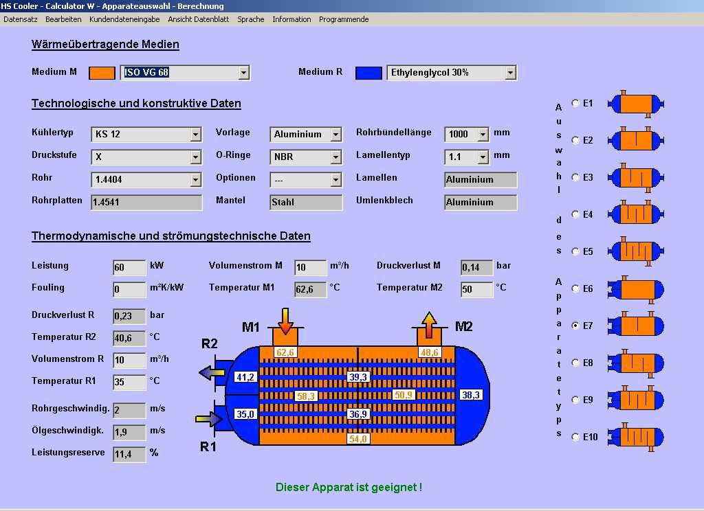 Die thermische Berechnung eines Ölkühlers erfolgt nach Eingabe der Medien, der technologischen und konstruktiven Apparatedaten, der Auswahl des Apparatetyps und Eingabe der thermodynamischen Daten. Die qualitative Eignung bzw. Nichteignung eines Apparates wird als Meldung angezeigt, parallel dazu erlaubt der berechnete Parameter "Leistungsreserve" eine quantitative Bewertung des Apparates. Zeigt ein geeigneter Apparat eine hohe Leistungsreserve kann durch Änderung des Apparatetyps, seiner technologischen oder konstruktiven Daten eine Annäherung an die "optimalen" konstruktiven Parameter des Apparates erfolgen.